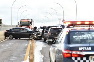 Três carros se envolveram em um acidente na Ponte Honestino Guimarães, na tarde desta segunda-feira (30/12). Uma funcionária da Embaixada...