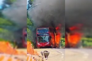 Um ônibus de turismo da Bustour pegou fogo, na manhã deste sábado (20/12), na Estrada do Caracol, em Canela, no...