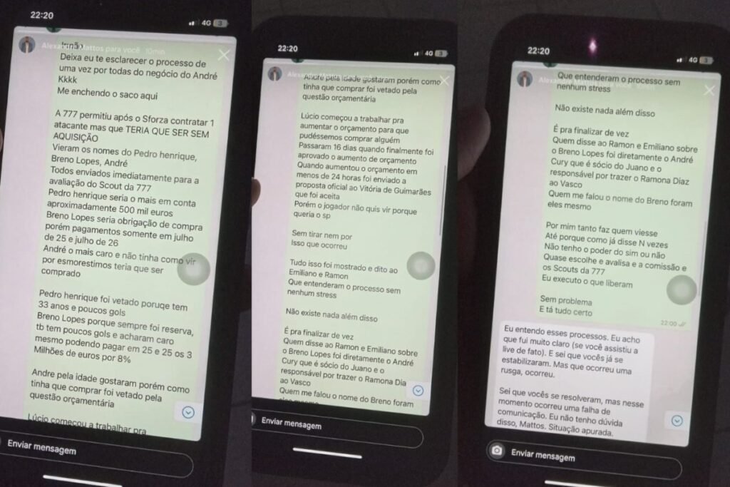 A demissão ocorre na semana em que vazou uma conversa de Alexandre Mattos explicando os processos de contratações da SAF. “Quem escolha e avalia é a comissão e os scouts da 777”, afirmou o dirigente numa das frases. Confira:
