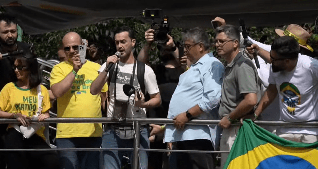 Barrado pela PF em aeroporto, português participa de ato pró-Bolsonaro e sobe em trio elétrico