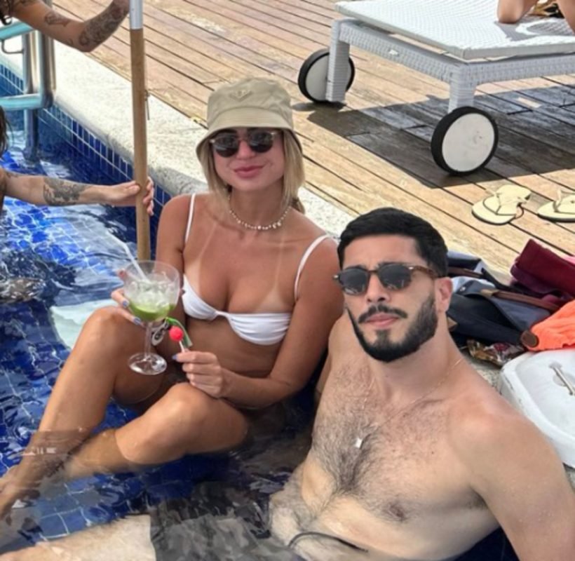 No registro, eles estão numa piscina, aparentemente aproveitando a onda de calor que assola o Brasil. Renata segura um drink e um pirulito, enquanto o artista faz um pose para a câmera.