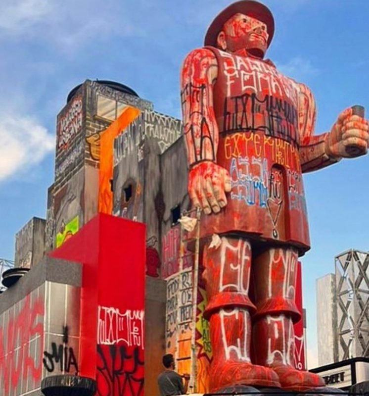 Carro alegórico da Vai-Vai com a representação da estátua de Borba Gato