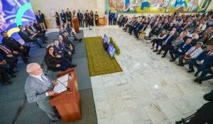 O presidente Luiz Inácio Lula da Silva (PT) posou para uma foto nesta segunda-feira (4) com uma bandeira da Palestina....