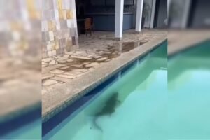 Um jacaré foi flagrado nadando em uma piscina de uma residência no bairro da Granja, em Salgueiro, sertão pernambucano. Segundo...