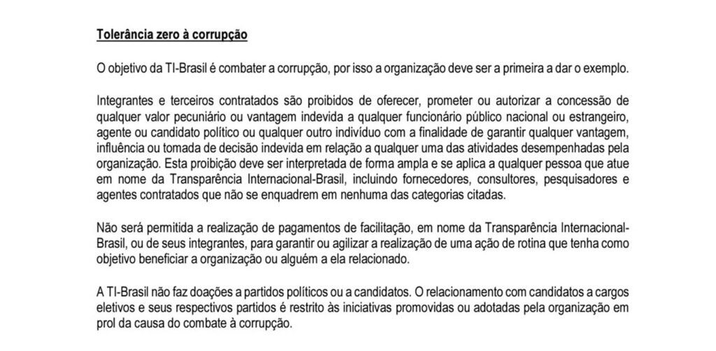 O código de ética da ONG, no entanto, proíbe esse tipo de ação. As normas estabelecem que integrantes e terceiros contratados não podem oferecer, prometer ou autorizar “a concessão de qualquer valor pecuniário ou vantagem indevida a qualquer funcionário público nacional ou estrangeiro, agente ou candidato político ou qualquer outro indivíduo, com a finalidade de garantir qualquer vantagem, influência ou tomada de decisão indevida a qualquer uma das atividades desempenhadas pela organização”.