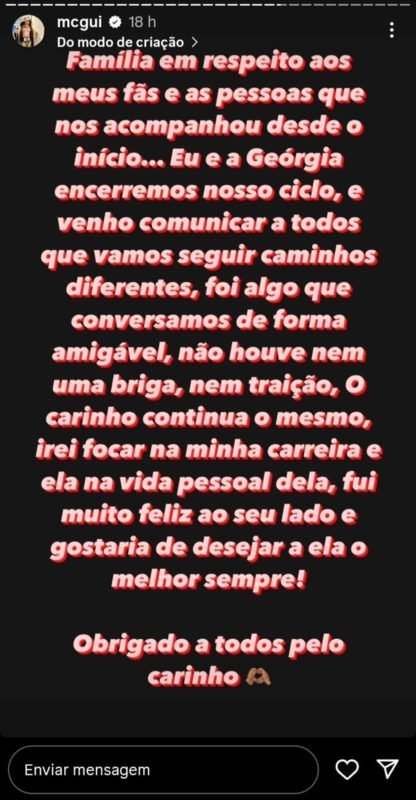 “Família, em respeito aos meus fãs e às pessoas que nos acompanharam desde o início… Eu e Georgia encerramos nosso ciclo e venho comunicar todos que vamos seguir caminhos diferentes”, disse MC nos stories do Instagram.