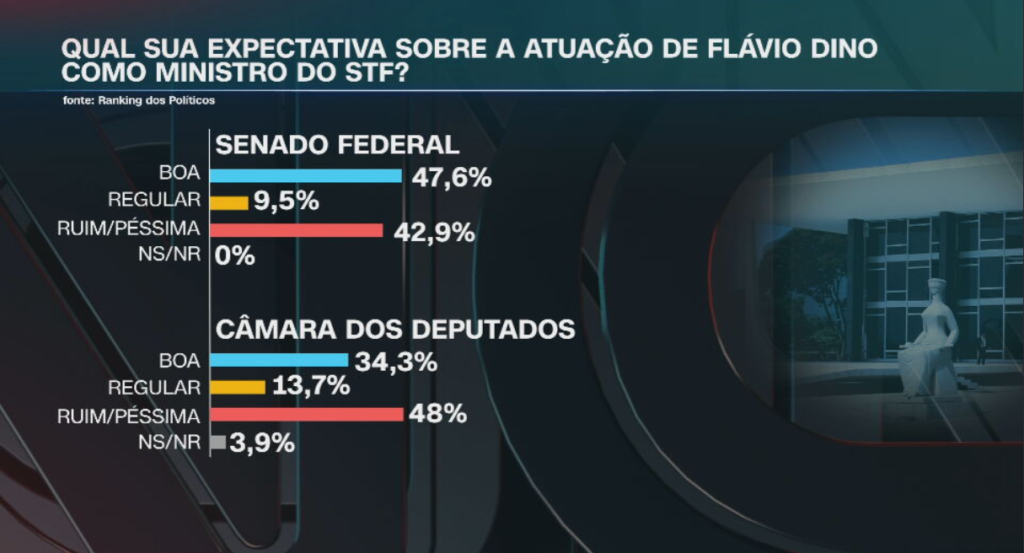 O levantamento quis saber o que os congressistas esperam da atuação do senador e ex-ministro da Justiça Flávio Dino como magistrado do STF. Dino assume na próxima quinta-feira (22) a cadeira de Rosa Weber, que se aposentou em setembro de 2023.