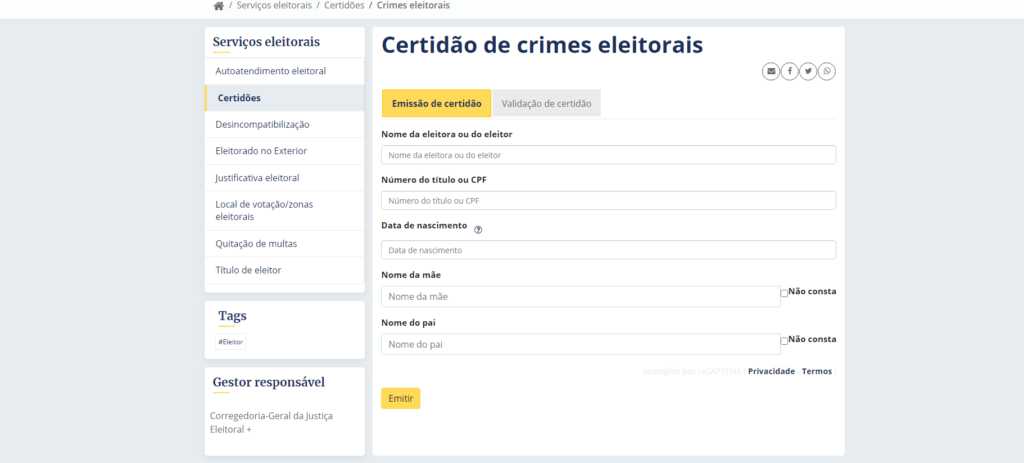 Para emitir de forma online, basta entrar no portal do Tribunal Superior Eleitoral, na aba de “Certidões”. Nessa área, o serviço valida cinco tipos de certidão; dentre elas, está a de crimes eleitorais.