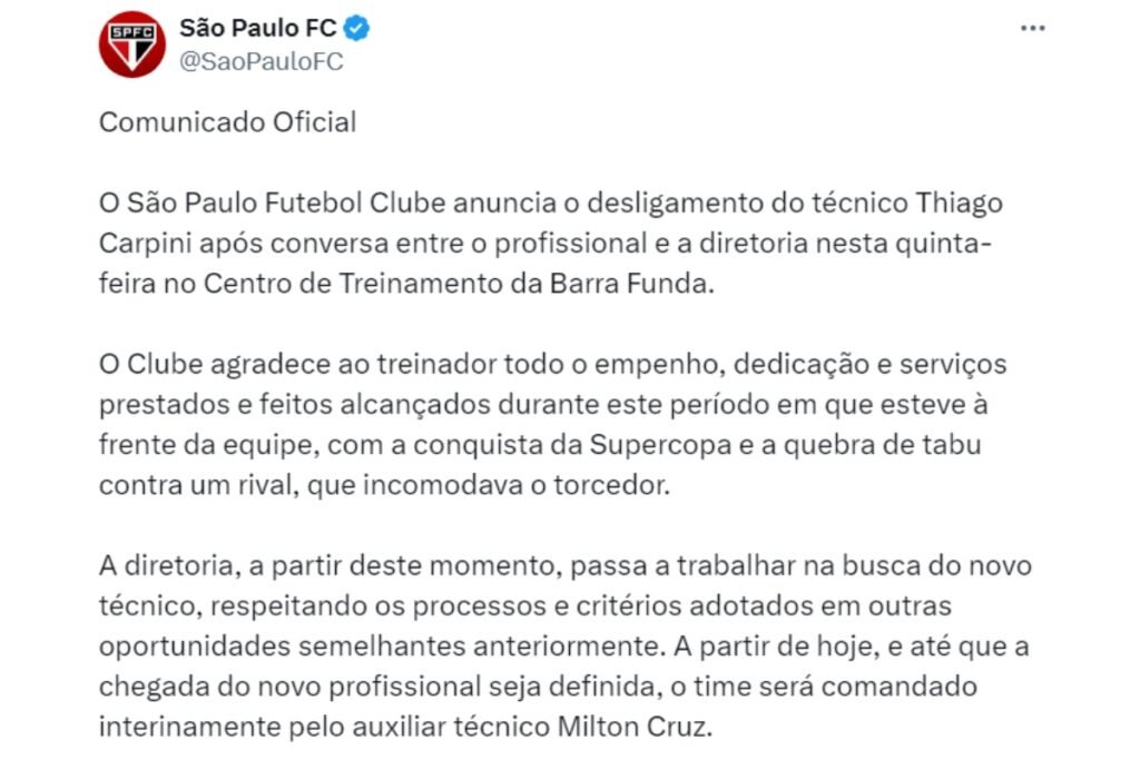 Em busca de um novo técnico, o São Paulo passará a ser comandado interinamente pelo auxiliar técnico Milton Cruz enquanto não acerta com o substituto de Carpini.
