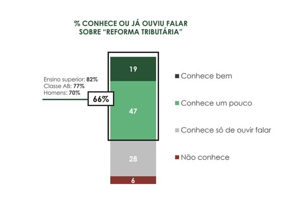 Dos entrevistados, 66% conhecem a reforma tributária (19% conhecem bem; 47% conhecem um pouco). Enquanto 28% conhecem a só de ouvir falar e outros 6% não conhecem o novo modelo de tributação.