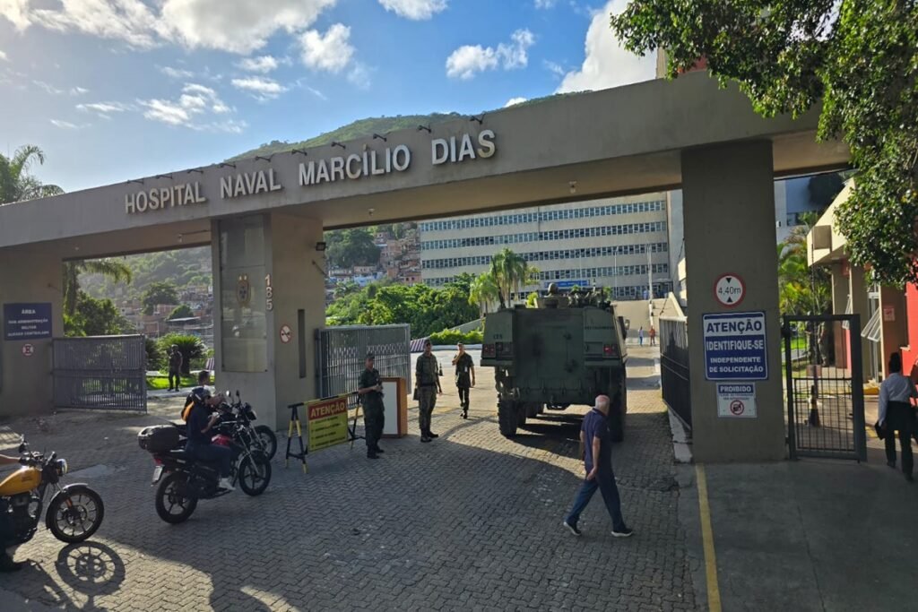 “No intuito de garantir a segurança da tripulação e usuários do Hospital Naval Marcílio Dias, a Marinha do Brasil exercerá ação de presença com meios de fuzileiros navais, na área sob sua jurisdição, adjacente àquela organização militar, até o limite máximo de 1.320 metros do seu perímetro”, informou a força armada em nota.