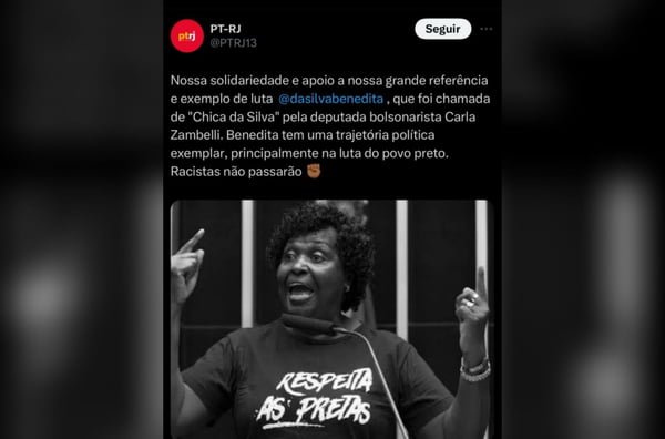 “Nossa solidariedade e apoio a nossa grande referência e exemplo de luta @dasilvabenedita, que foi chamada de ‘Chica da Silva’ pela deputada bolsonarista Carla Zambelli. Benedita tem uma trajetória política exemplar, principalmente na luta do povo preto. Racistas não passarão.”
